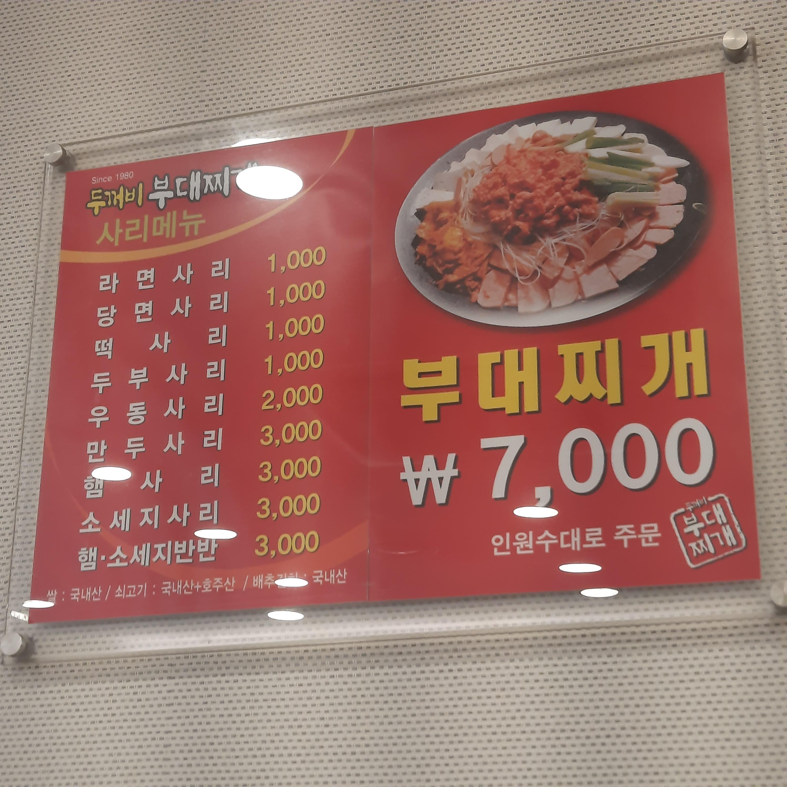 부천 시청 주변에 위치한 두꺼비 부대찌개 . 1인분 7천원. 밥, 반찬 무한리필 가능.