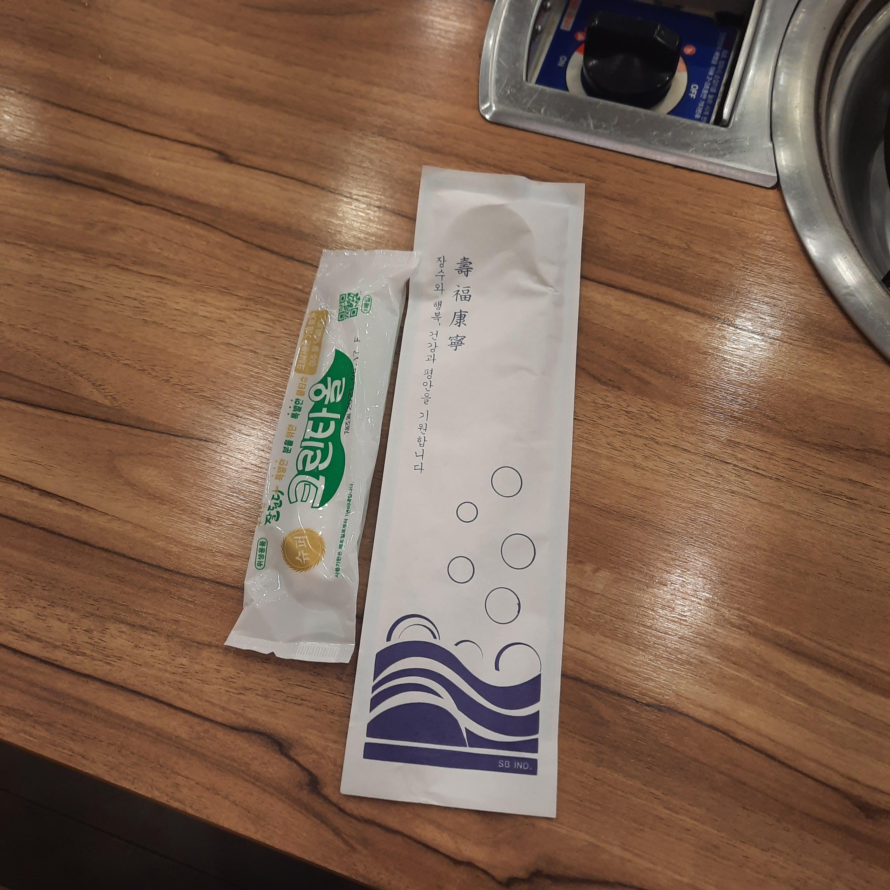 밥상 옆에 서랍을 열면 숟가락과 젓가락 한 세트가 종이에 포장되어 있다. 매우 위생적여 보였다. 손 물티슈도 함께!