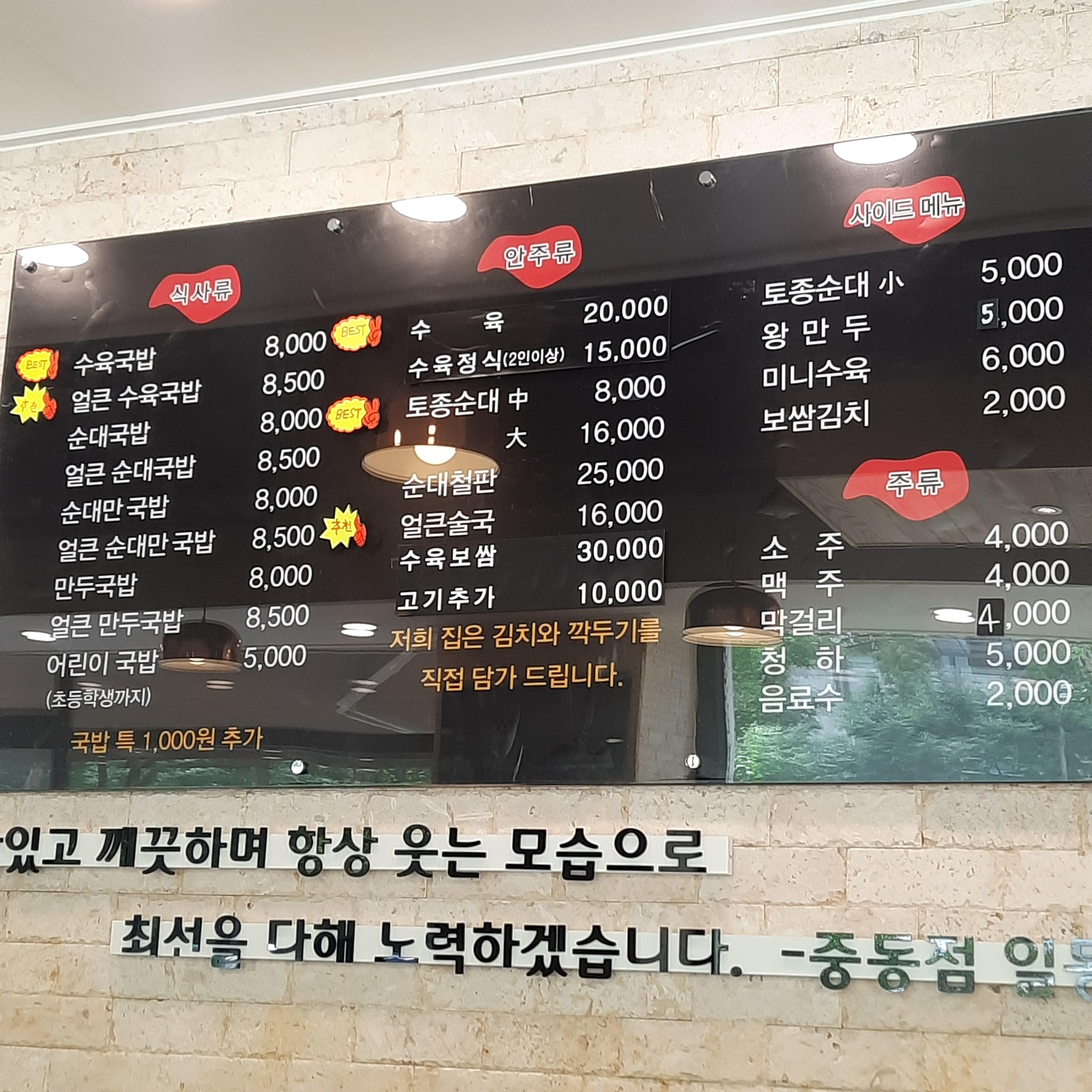 메뉴판이 아주 큼직하더라. 수육국밥, 매운 수육국밥, 순대국밥, 매운 순대국밥, 아니면 순대만..