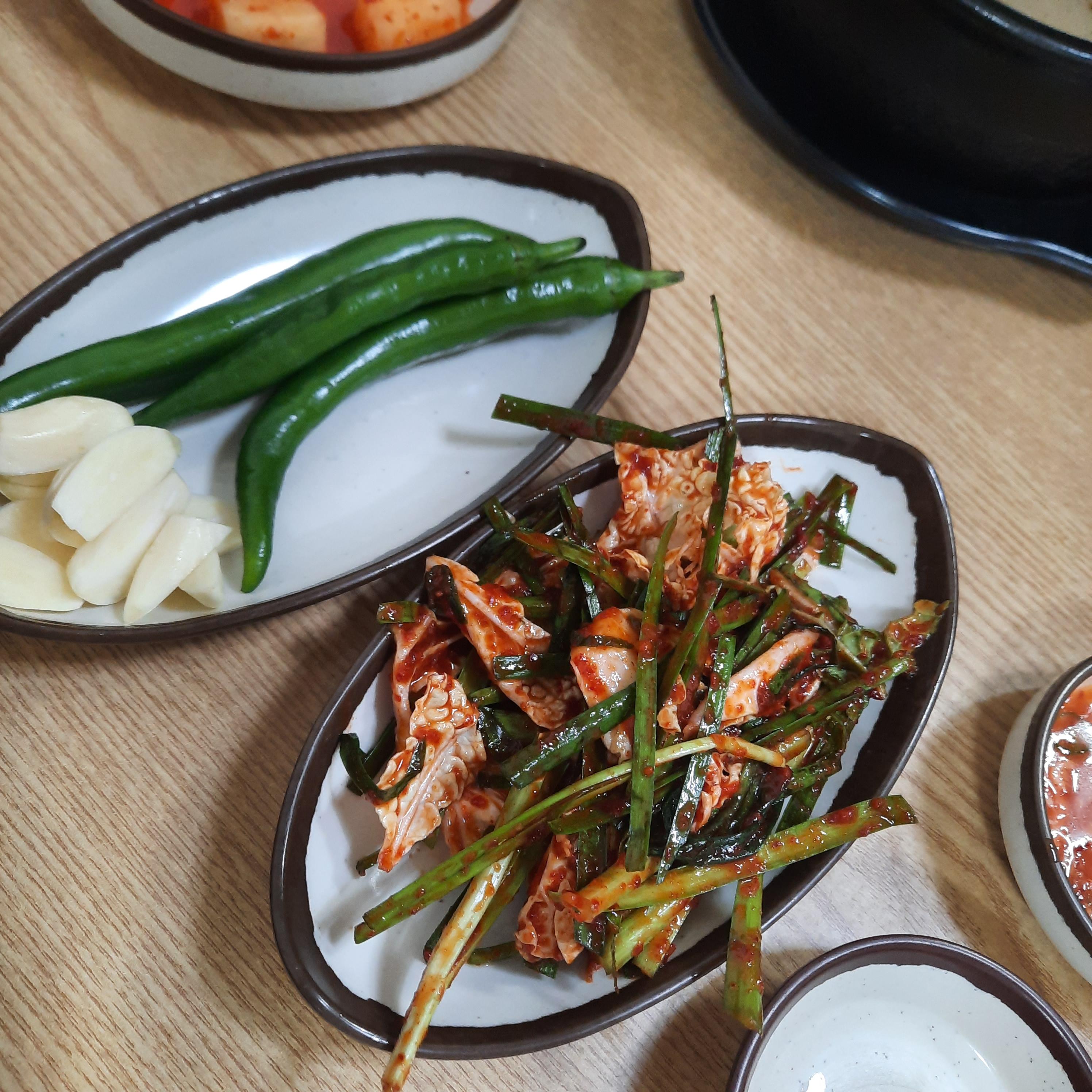 기본찬은 깍두기, 고추, 마늘, 양파, 된장, 다대기, 새우젖...ㅡ 겉절이. 겉절이 맛잇드랔ㅋㅋ 들깨가루 구비되어있음!!