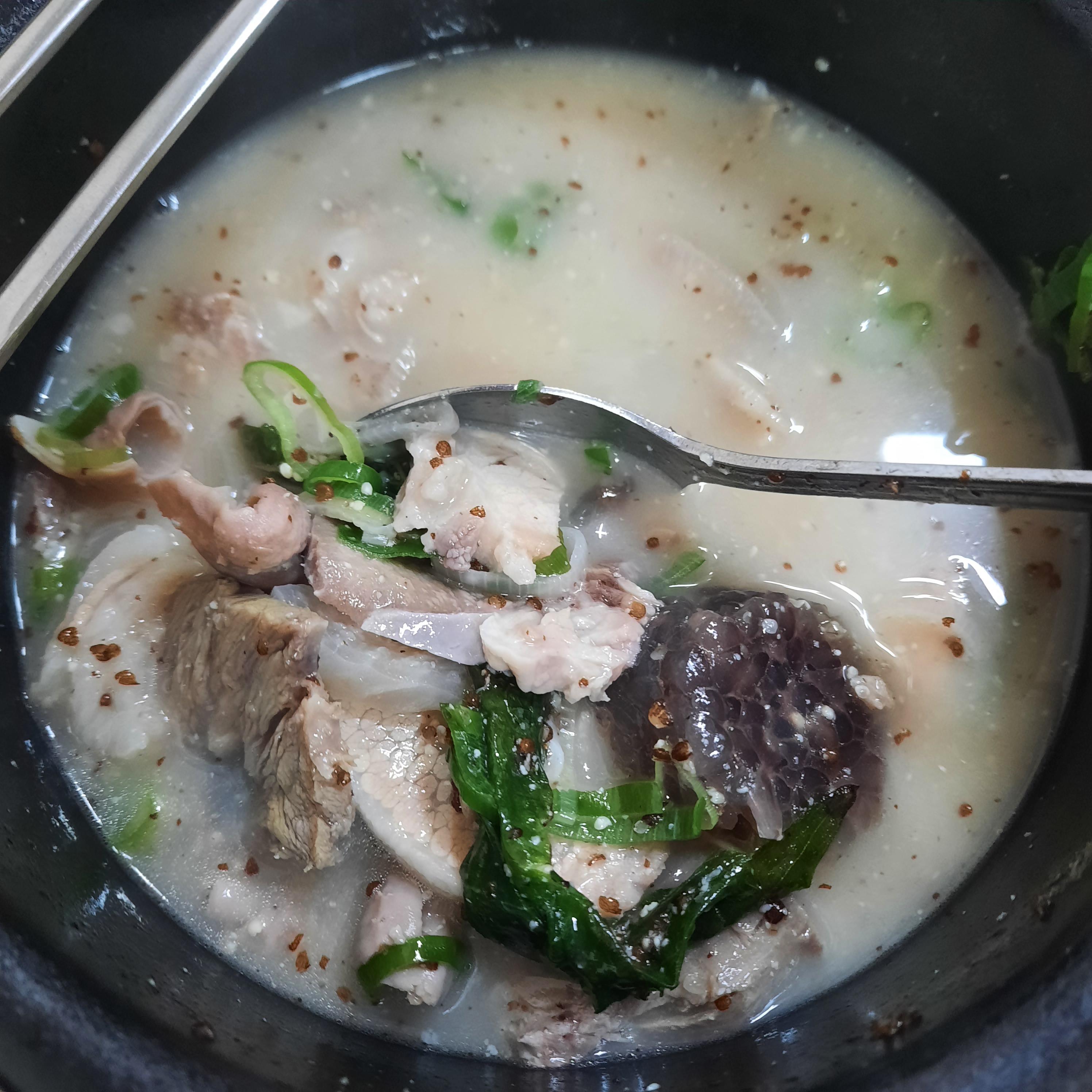 처음에 기대를 좀 많이했다. 블로그 리뷰가 좀 있길래 간거였는데 국물 색깔에서 실망하고 맛에서는 아. 이 맛이 아님. 국물이 내가 생각하는 진한맛이 아니다. 이 집도 국에 간이 되어져서 나온다.