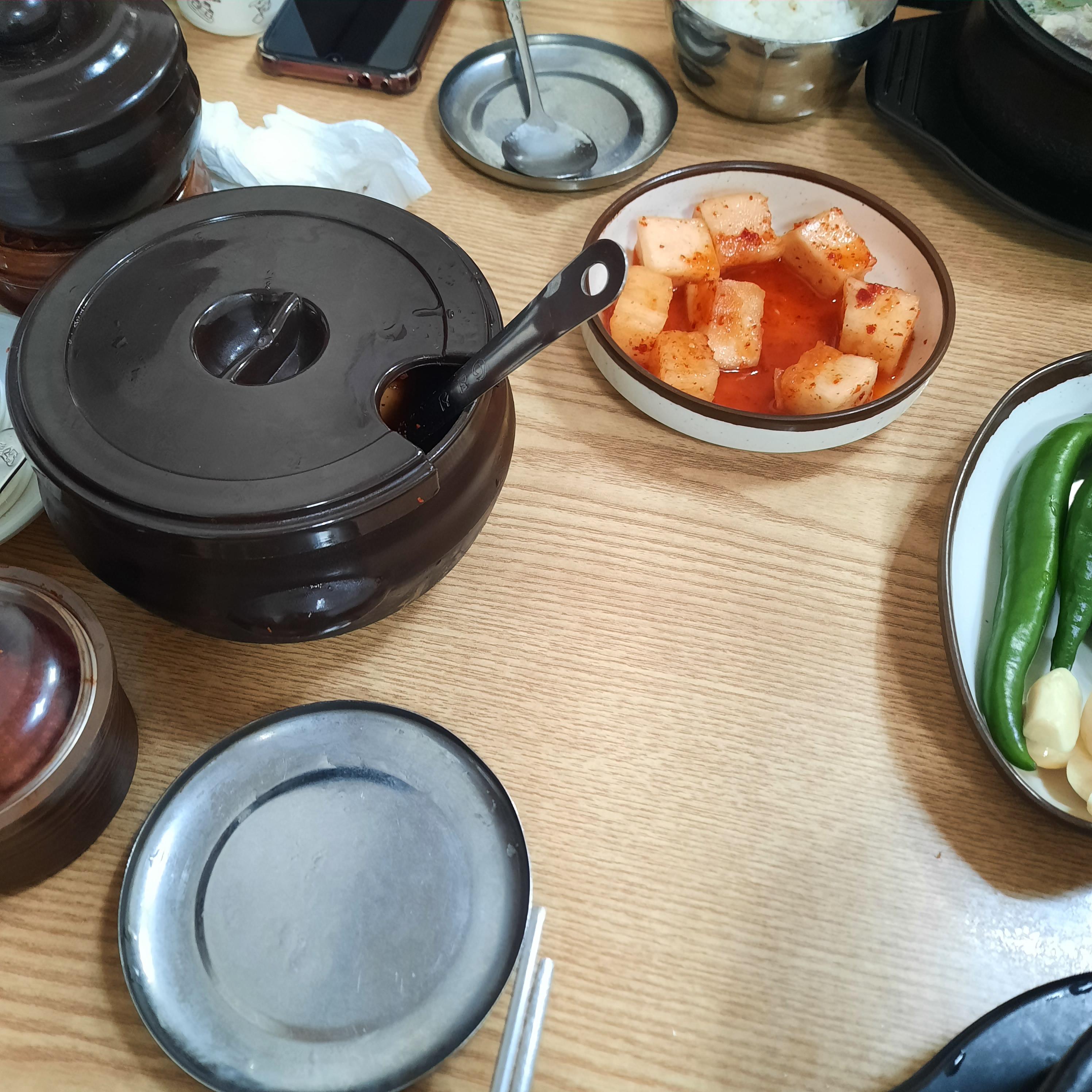깍두기는 뚝배기에 나와서 알아서 퍼먹는 시스템이다. 좌식임. 하지만 셀프바가 별도로 있을정도로 넓은곳이 아니기 때문에 앉아서 계속 먹음.