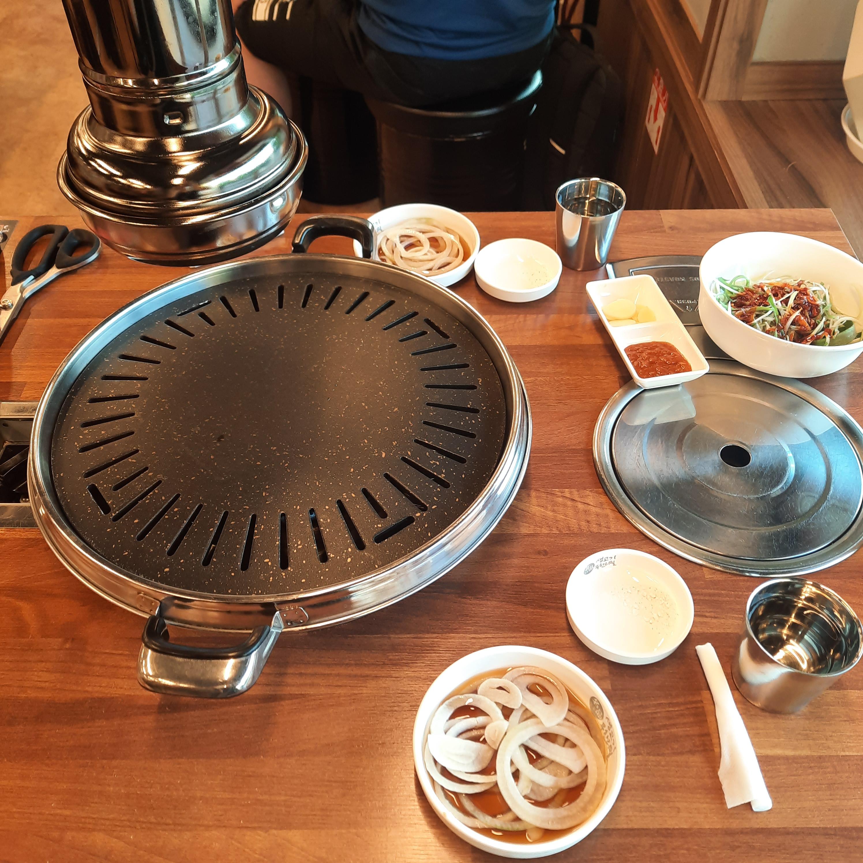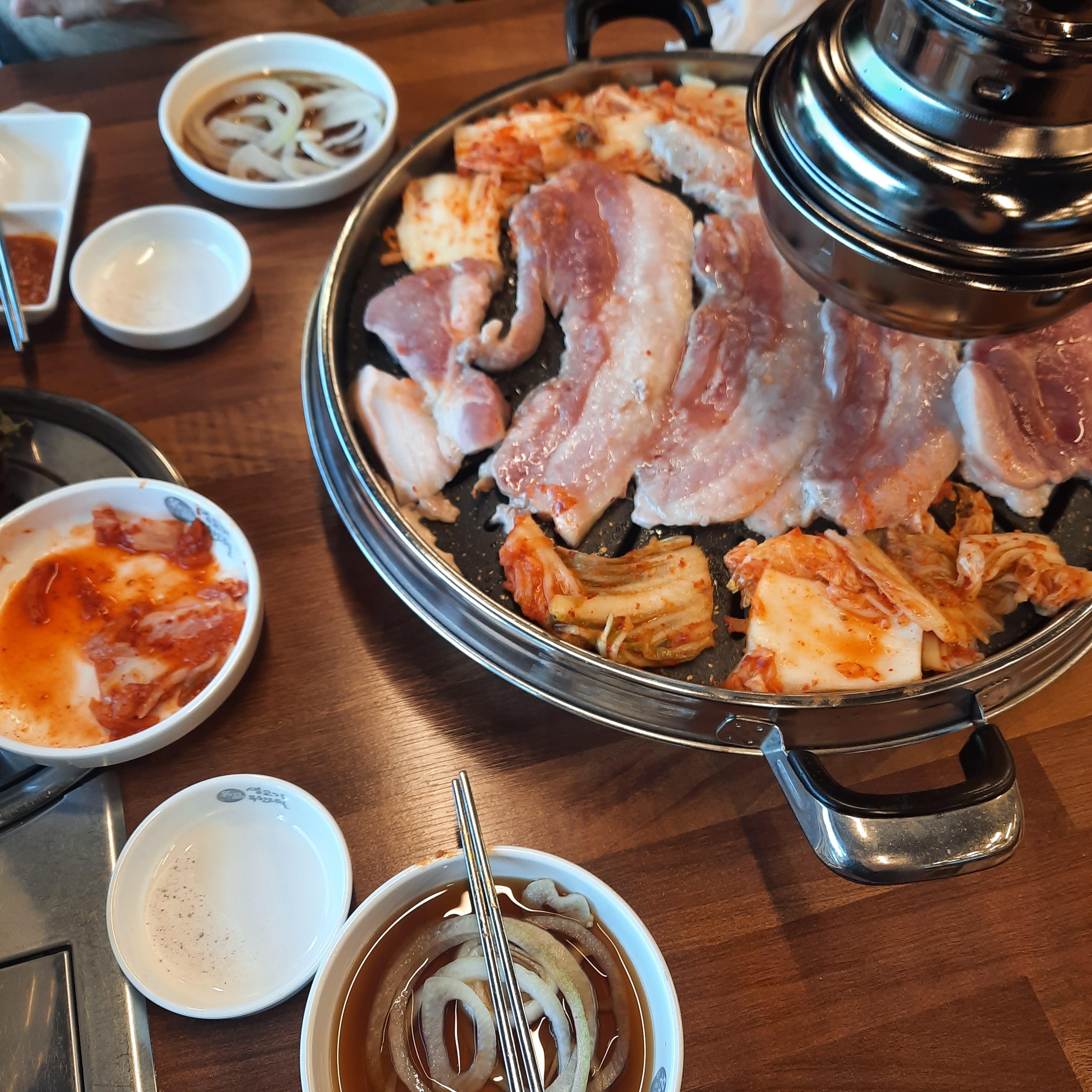 고기를 퍼먹는 시스템은 아니고 알림벨 눌러서 이모님한테 한판 더 달라고 하면 머리수에 맞게 주고 그리고 골라서 먹을 수도 있는 것 같았다. 삼겹살만 주세요라던지, 목살만 주세요 등 리필판부터 골라 먹을 수 있는 듯 했지만 나는 같은거 시켜먹음.