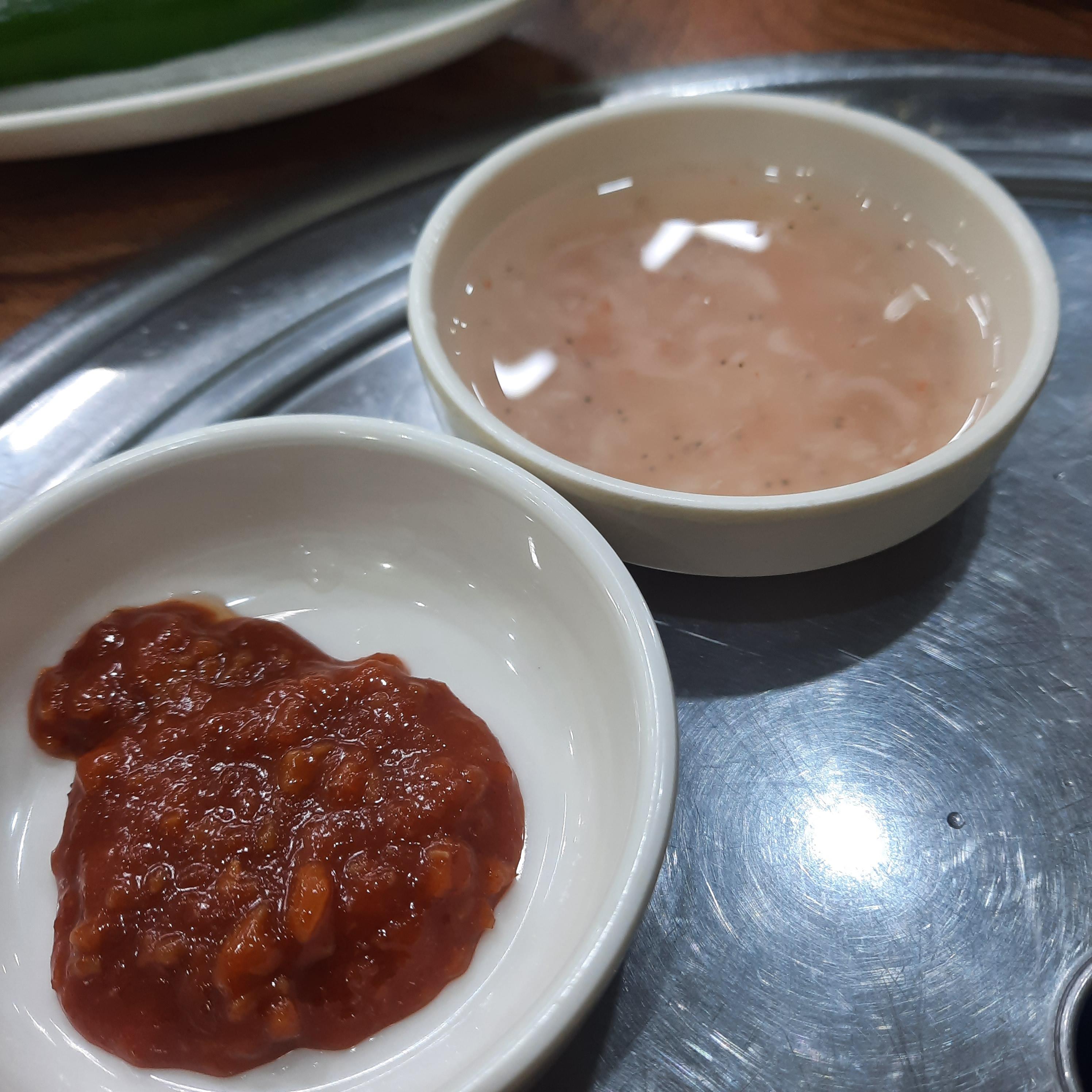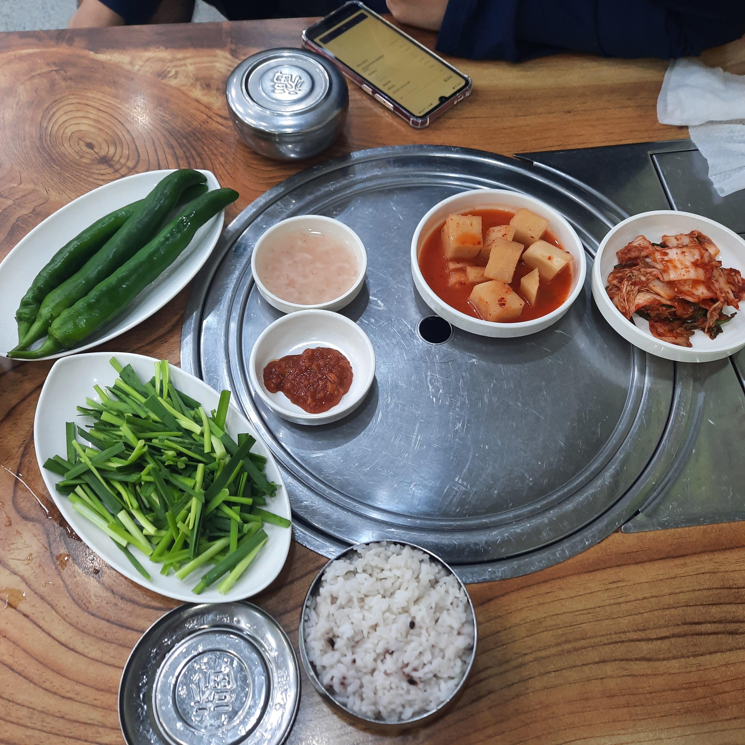 반찬 등반! 아삭이 고추!!! 와우! 깍두기 맛있음. 배추김치도 괜찮음. 부추는 2인분임. 밥은 흑미 조금 섞인 밥. 새우젓갈은 새우가 별로 없음. 쌈장은 해찬들 고기쌈장맛이 남.
