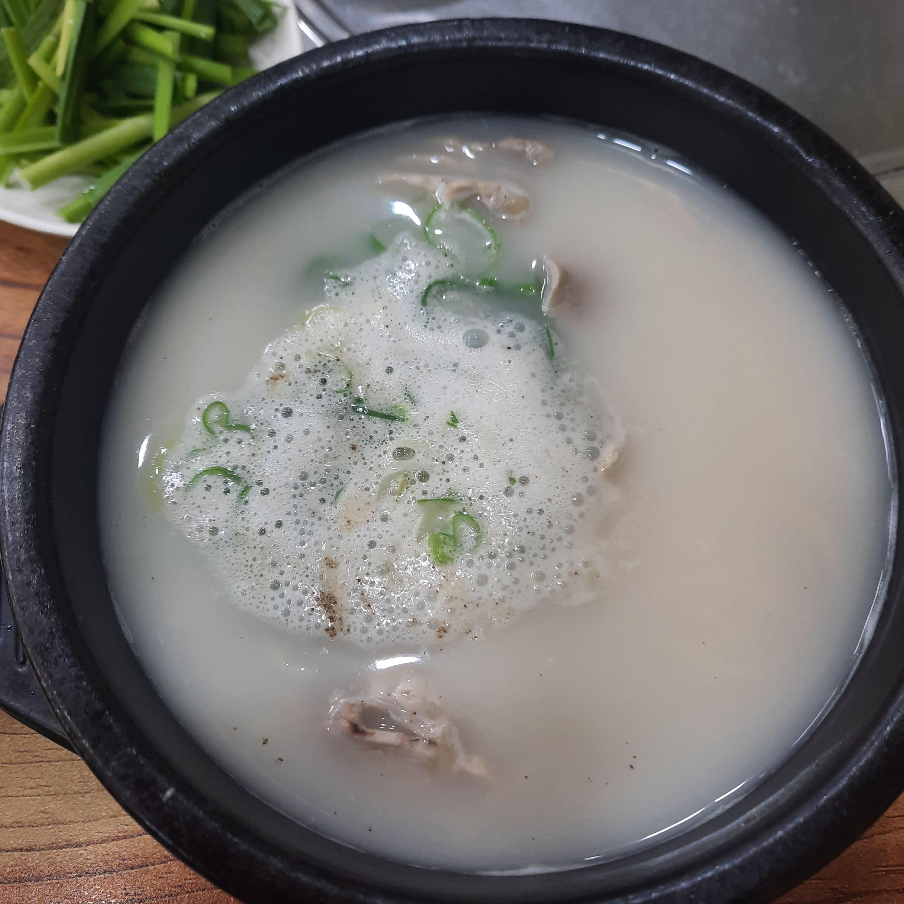 처음에 뭔가 뽀얀 느낌이 나서 호옹이 이거다!!!! 하고 먹었는데 일단 국물은 내가 좋아하는 국물이다. 간이 안된 뽀얀 국물. 약간 고소한 맛 나는 국물... 먹으면서 생각해봤는데 이 집은 도가니탕이 있으므로 사골국을 쓰는 것 같다. 그 부분은 매우 좋았는데.. 아....간이 안 맞춰진다..