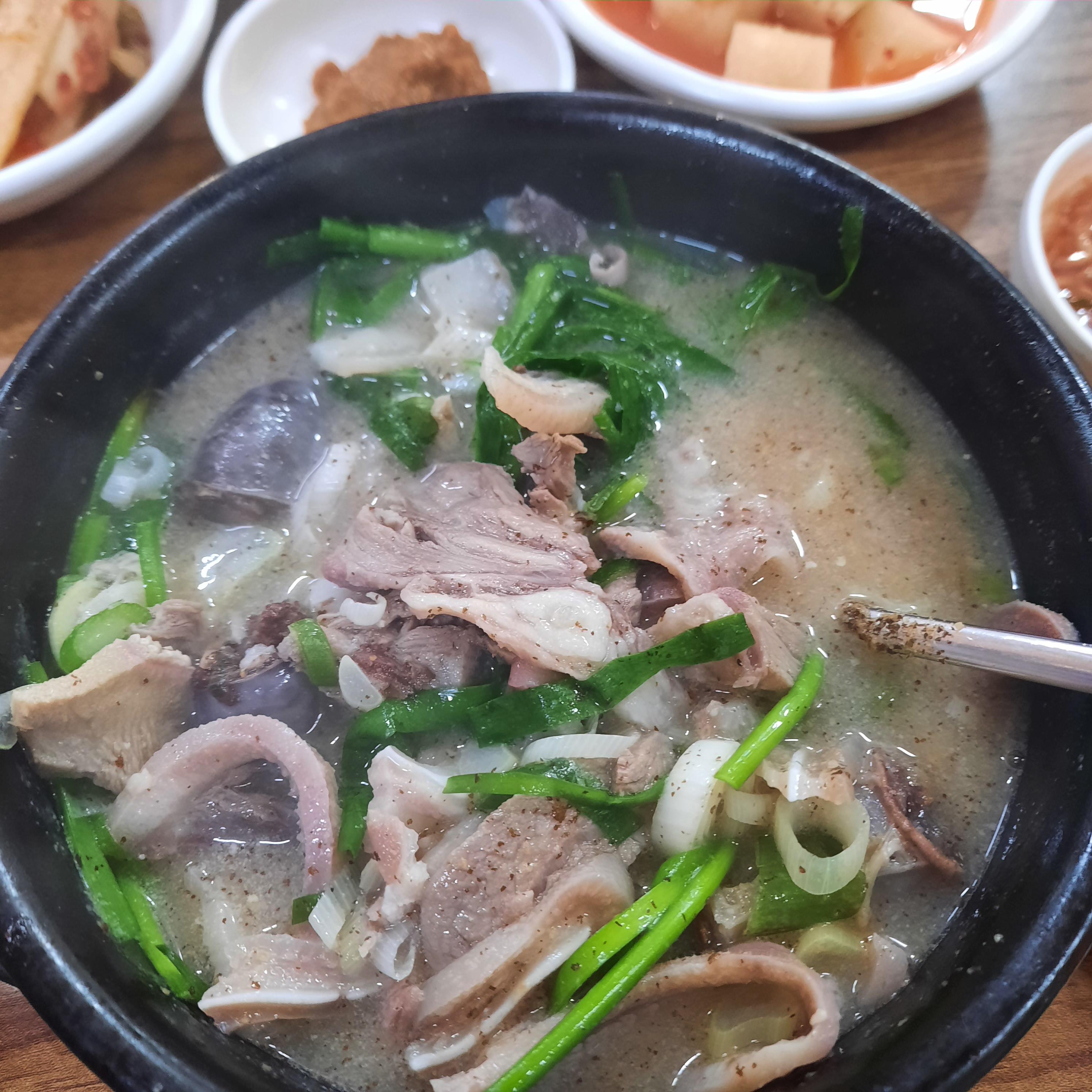순대국 보통이 나왔다. 이 집은 부추가 넣어져서 나온다. 그리고 파가 많이 들어가있다. 곰탕이 있는 집 특징이 돼지국밥에도 파를 많이 넣어준다는 것 ㅋㅋ 국물은 사골국 맛이 확실히 난다. 국밥이 바로 나오자말자 나는 순전히 국맛을 보는데 사골의 맛은 약ㄱ~~~~~~간 ㅇ연하긴한데 깔끔했다. 살짝 간이 되어서 나오는 사골국이었다.
