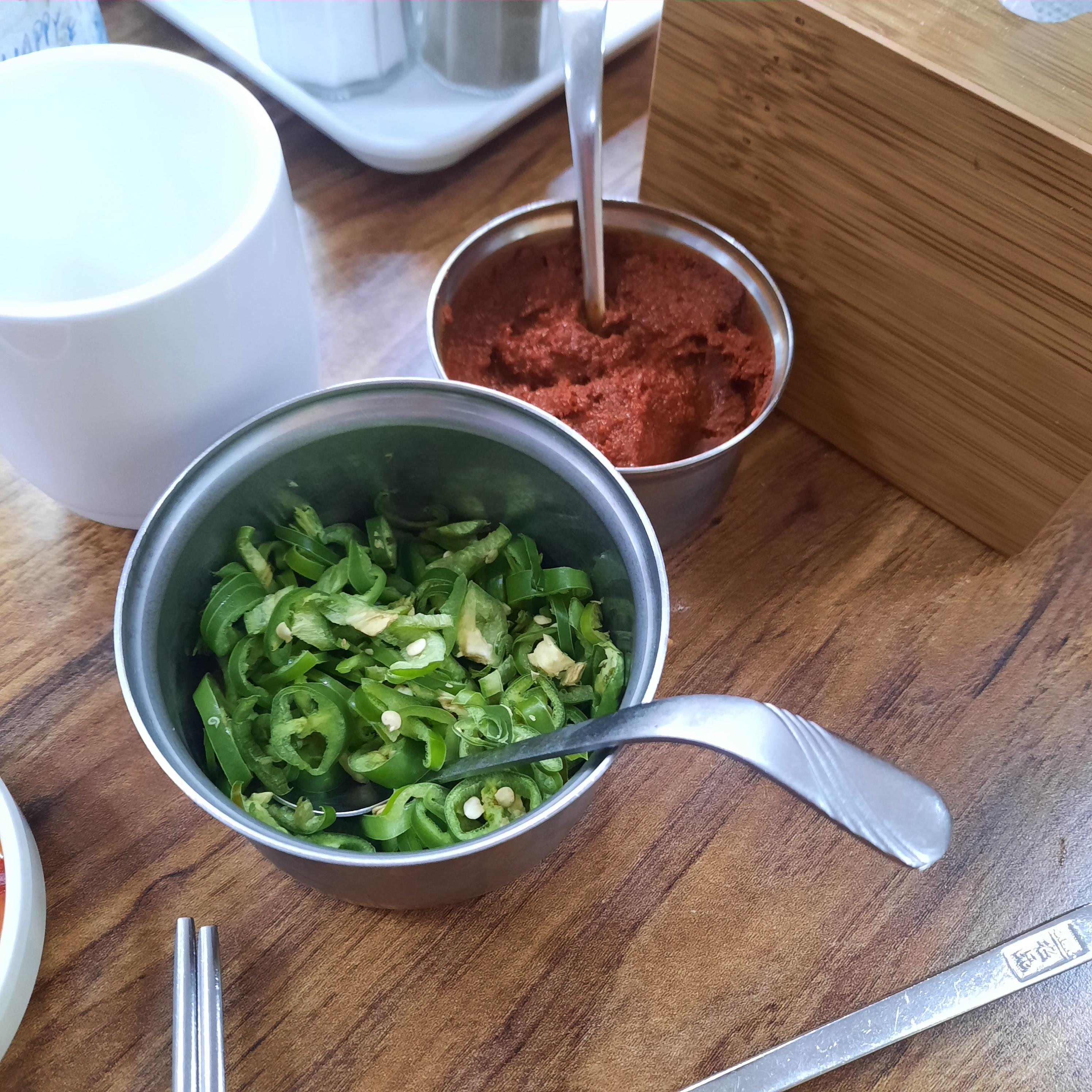 주문하고 반찬이랑 같이 나오는 땡초와 다대기. 다대기 맛은 보지 않았다.