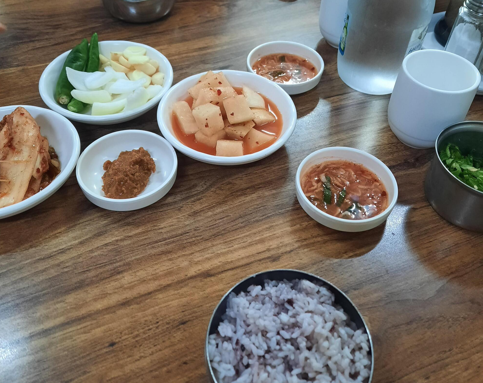 기본 반찬구성이다. 사이드 메뉴는 90점이다 ㅋ.ㅋ...... 밥은 검정쌀과 섞인밥, 깍두기랑 김치는 맛있었다. 양파와 마늘이 나온다! 예예!! 양파와 마늘! 고추는 약간 매운 고추가 나온다. 새우젓갈은 빨간색이다. 작게 잘린 땡초와 다대기를 갖다주셨다. 아 사진엔 없는데 들깨가루가 구비되어있다. 특이한게 숫가락으로 퍼서 쓰는 그릇이 아닌 큰 소금통에 들어가있어서 탁탁 뿌려먹었다 ㅋㅋ 근데 들깨가루가 진탱 고소한 맛이 났다. 가루 색깔이 콩이나 참깨 색깔과 비슷해서 처음에 참깨가 섞인 들깨가룬 줄 알았다. 그런데 그냥 들깨가루인 것 같더라... 들깨가루가 산화가 안된 좋은 상태였다. 곱게 꾸덕하게 갈린 질감이었다. 물론 공기에 노출이 되어서 약간 뭉친 것들도 있었지만,